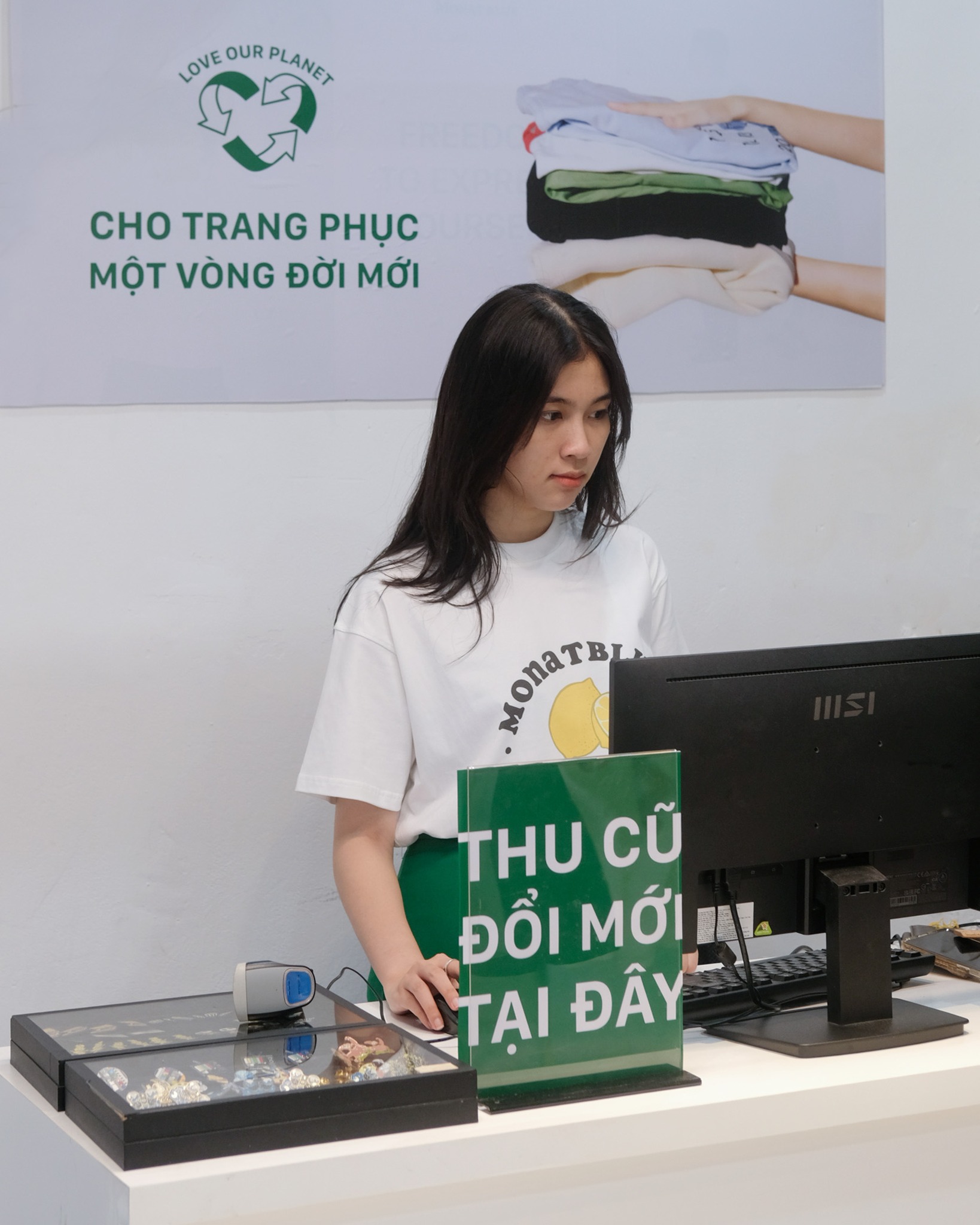 Thay vì chất hàng đống các áo thun cũ không còn được sử dụng để "chuẩn bị" thải ra ngoài môi trường, hãy mang đến Monat blue đổi lấy sản phẩm mới. Việc tăng vòng đời sử dụng sản phẩm là một cách hay ho để giảm thiểu lượng rác thải ra ngoài môi trường.